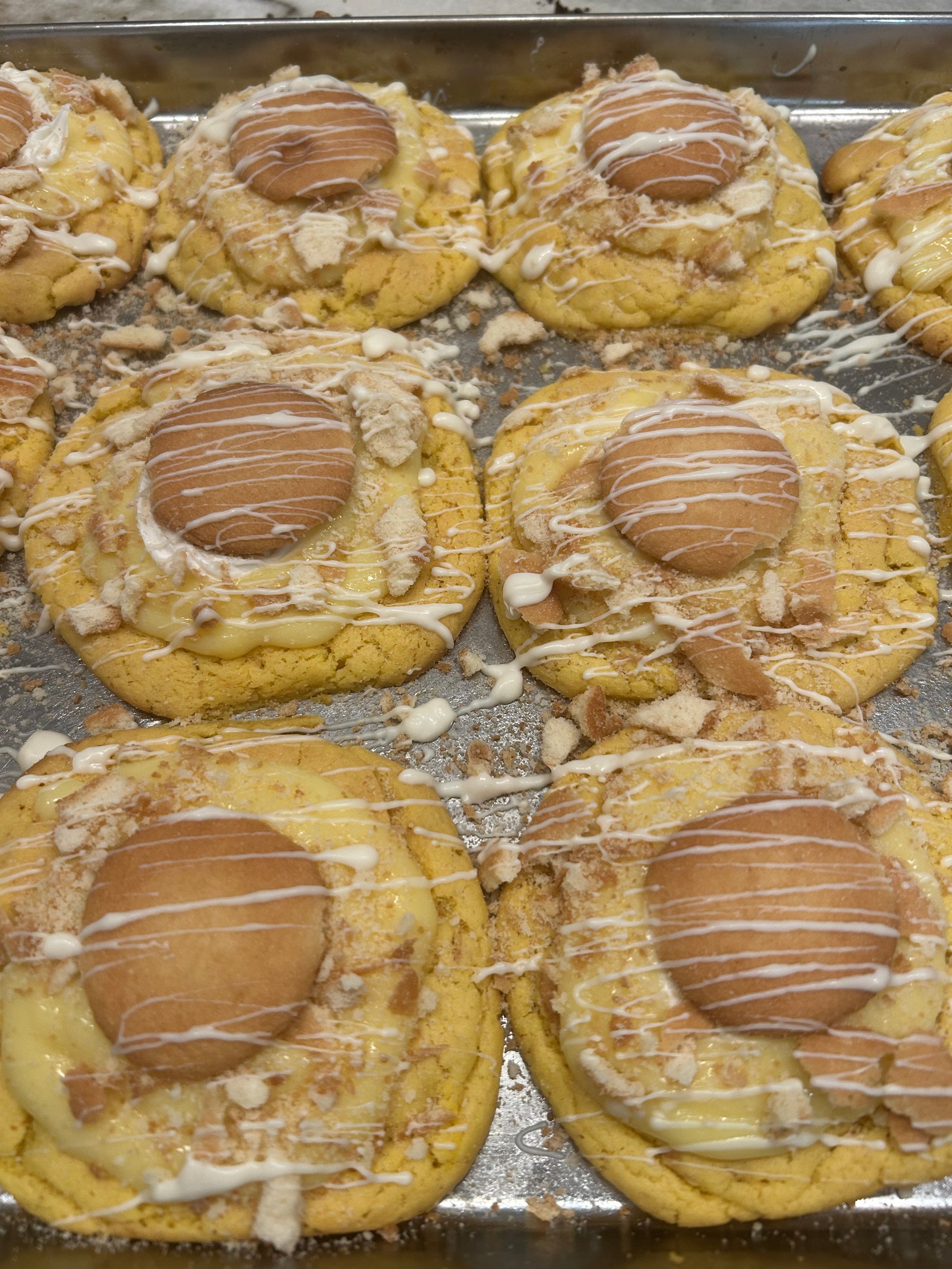 Soft, buttery banana-flavored cookies loaded with crunchy vanilla wafer pieces, homemade pudding, topped with a white chocolate drizzle — a sweet, nostalgic twist on classic banana pudding in every chewy bite.