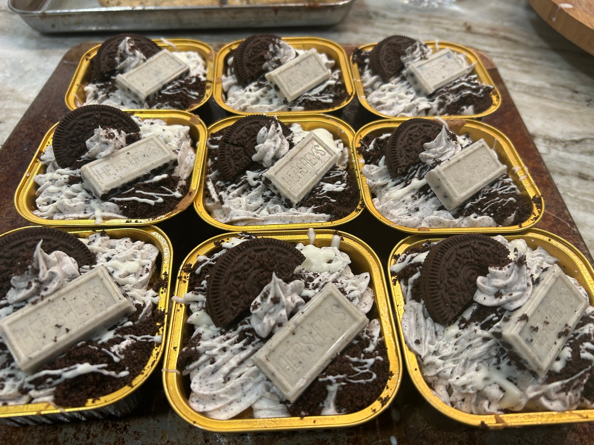A sweet Oreo cake topped with Whipped Frosting, Oreo Cookies, and Cookies and Cream Hershey Bars. Perfect for cookies-and-cream lovers who want a cake that taste like a whole dessert experience.